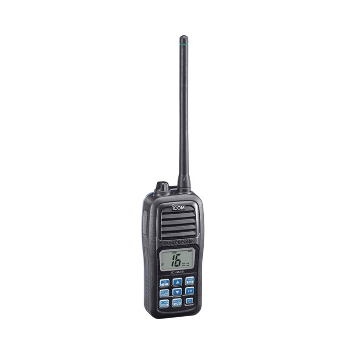 The IC-M23 is powered by the 3.7V Lithium-Ion battery pack, BP-266, to reduce the capacity and weight of the radio. A newly developed PA circuit provides 5W (approx.) RF output and powerful 600mW (typ.) audio even at this low voltage, while saving battery consumption for 10 hours of operating time.*